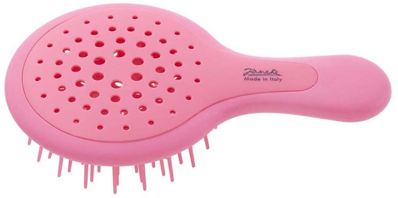 A Jäneke keféket 1830 óta gyártják Olaszországban, és kiváló minőségű hajkeféket kínálnak egyedi színtervezéssel. A Jäneke Superbrush Mini utazó változata multifunkcionális, és száraz, illetve nedves haj formázására és kifésülésére lett tervezve. Szellőzőnyílásainak köszönhetően felgyorsítja a hajszárítást, és biztosítja a forró levegő egyenletes eloszlását. A haj pillanatok alatt megszárad, teljes térfogattal és textúrával. Minden hajtípusra alkalmas. A Carbon technology megakadályozza a statikus elektromosság kialakulását a hajban. Gyerekek hajára és hajhosszabbításra is alkalmas. A sörték nejlonból készülnek.