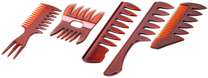 5 egyedi fésűből álló professzionális fésűkészlet a haj kibogozásához és formázásához. mindegyik a legapróbb részletekre is figyelve, kiváló minőségű anyagokból készült. szokatlan formájúak és időtálló színekkel rendelkeznek. tökéletesek még a nagyon vastag haj kibogozásához is.