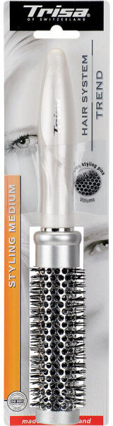 Trisa Trend Spring Styling Medium Hajkefe - Ezüst ?️ A Trisa Trend Spring Styling Medium hajkefe ideális választás a mindennapi hajformázáshoz. A hővezető fémcsőnek köszönhetően gyengéden és hatékonyan formázhatod a hajad, elegáns frizurát készítve szárítás közben. Főbb jellemzők:Átmérő: 40 mm Ergonomikus fogantyú: Kényelmes fogást biztosít a könnyű használat érdekében. Hővezető fémcső: Segít a haj gyors és egyenletes formázásában. Anyag: Kadmiummentes szintetikus anyagból készült fogantyú, szintetikus fej, fémcső és csavart nylon szálak. Ez a hajkefe tökéletes választás a gyors és egyszerű hajformázáshoz, miközben kíméli a hajad. ✨
